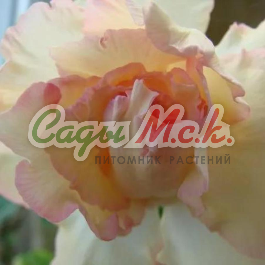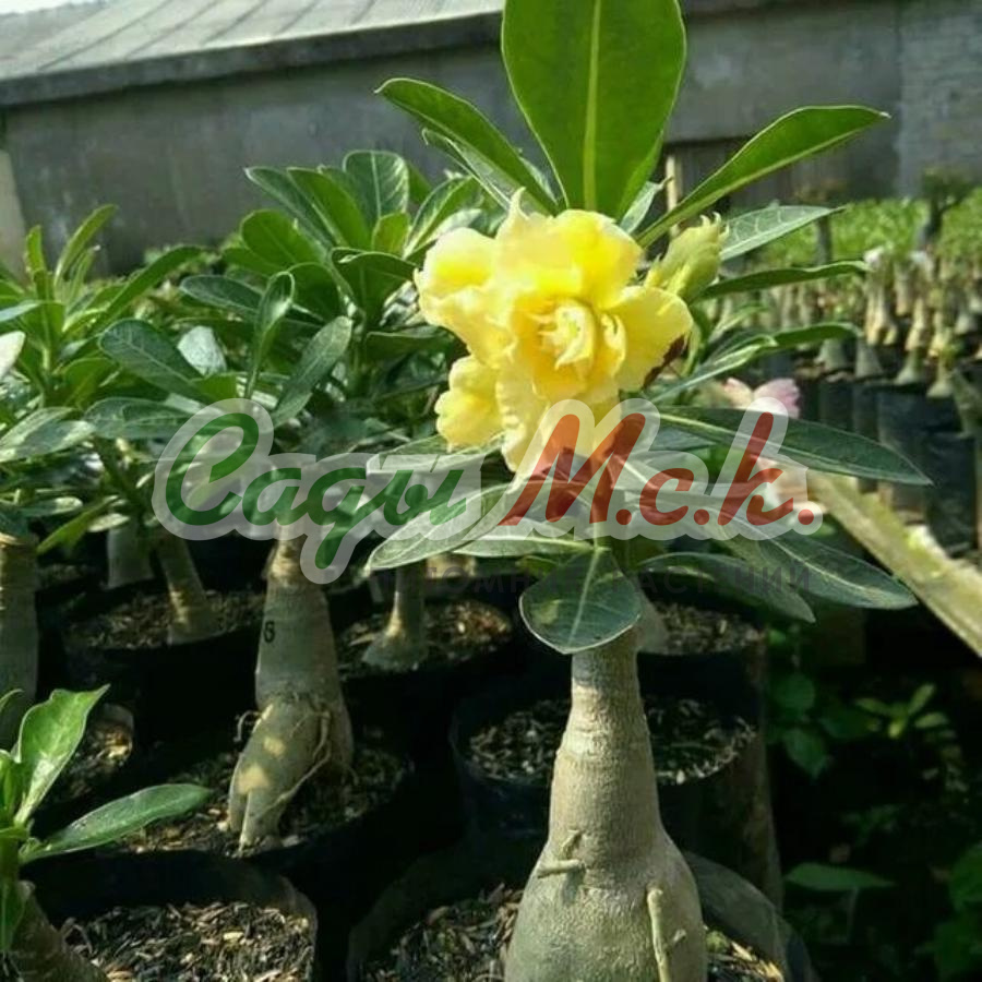 Adenium Chankajang - декоративное деревце уникальной формы. Ствол серый. Цветки большие, пышные, трехцветные. Лепестки закругленные, волнистые. Окрас лепестков желтый у основания, белый с розовыми оттенками в центральной части с насыщенно-розовой каймой.