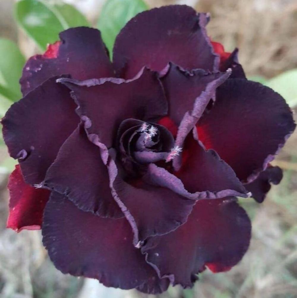Adenium Black Window растет как маленькое деревце или кустарник высотой 60-80 см. Цветки большие, махровые, с закругленными, слегка гофрированными по краям лепестками. Окрас цветка очень темный, фиолетовый с розовой каймой.