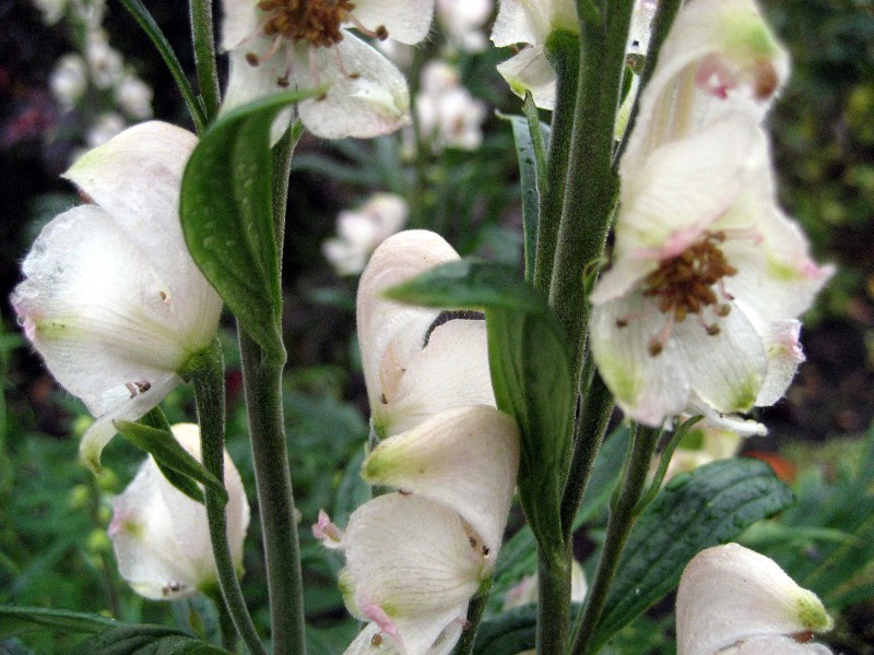 Eleonora – красивая садовая форма травянистого лекарственного растения из рода Аконитов клобучковых. Главная особенность – эффектные белые цветы, украшенные по краям узким красным ободком. Как и у остальных представителей, у этого экземпляра цветки собраны в густые кистевидные соцветия, устремленные вверх.