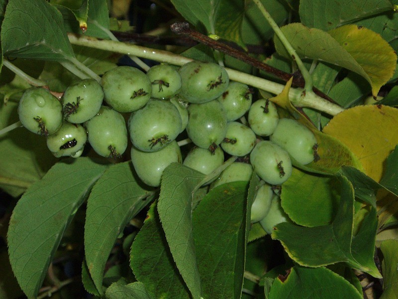Актинидия Приусадебная - лиана относительно зимостойкая, средне - сильнорослая, раннего срока созревания (середина августа – начало сентября). Плоды крупные (средняя масса 2,28 г, максимальная - 3,5 г), изящные, удлинено – цилиндрической формы, оливково -зеленые, кисло- сладкие с фруктовым ароматом, осыпаются при перезревании. Листья – некрупные, округлые, зеленые, краснеющие к осени. Урожайность средняя – 1,0 – 2,1 кг/куст