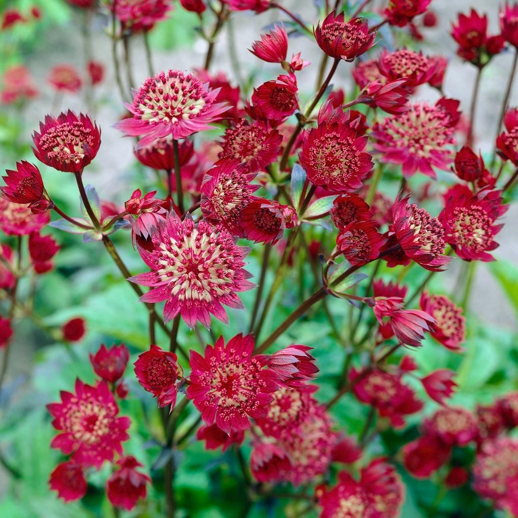 Астранция крупная Moulen Rouge — эффектное растение с полушаровидными соцветиями пурпурно-бордового цвета. Образует аккуратные раскидистые кустики высотой 60 см и около 35 см в диаметре. Стебли прямые, почти без листьев. Зелень формирует пышную розетку у основания стебля. Цветки небольшие, зонтичные, в диаметре около 2,5 см. Расцветает растение в июне и цветет до сентября.