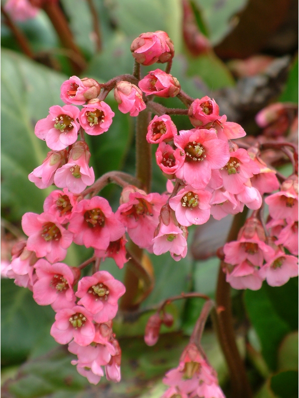 Корневая система Бадана Брессингем Салмон хорошо развита и располагается близко к поверхности почвы. В период цветения образуются длинные цветоносы высотой 20-50 см с многочисленными бутонами, имеющими форму бокала. Диаметр цветков 2-3 см, а окраска в зависимости от разновидности бадана может быть от белой до насыщенной розово-лиловой. Цветение начинается ранней весной, сразу после схода снега, и продолжается около 1,5 месяцев.