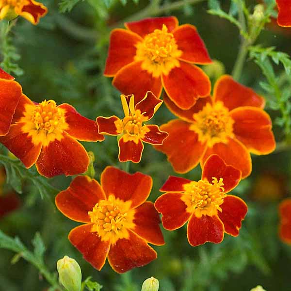 Обильно цветущий сорт для ярких нарядных цветников. Растение сильноветвистое, формирует раскидистый кустик с изящными перисто-рассеченными листьями. В пору цветения растение похоже на цветущий шар, усыпанный красно-коричневыми с желтой серединкой соцветиями – корзинками до 3 см в диаметре. Бархатцы теплолюбивы и светолюбивы, засухоустойчивы, отзывчивы на плодородие почв. Высаженные рядом с огородными культурами, они уменьшают их поражение грибными заболеваниями, особенно фузариозом, защищают от некоторых видов нематод. На рассаду высевают в начале апреля. В открытый грунт можно высевать в конце мая — начале июня. Всходы появляются на 5-10 день. Широко используются в озеленении при оформлении бордюров, для выращивания в контейнерах, вазонах. Пригодны для выращивания в ампелях на балконах и лоджиях.