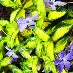 Барвинок Блю энд Голд - это почвопокровный многолетник высотой до 15-20 см. Отличается высокой декоративностью благодаря интересным 5-лепестковым цветкам нежно-синей
