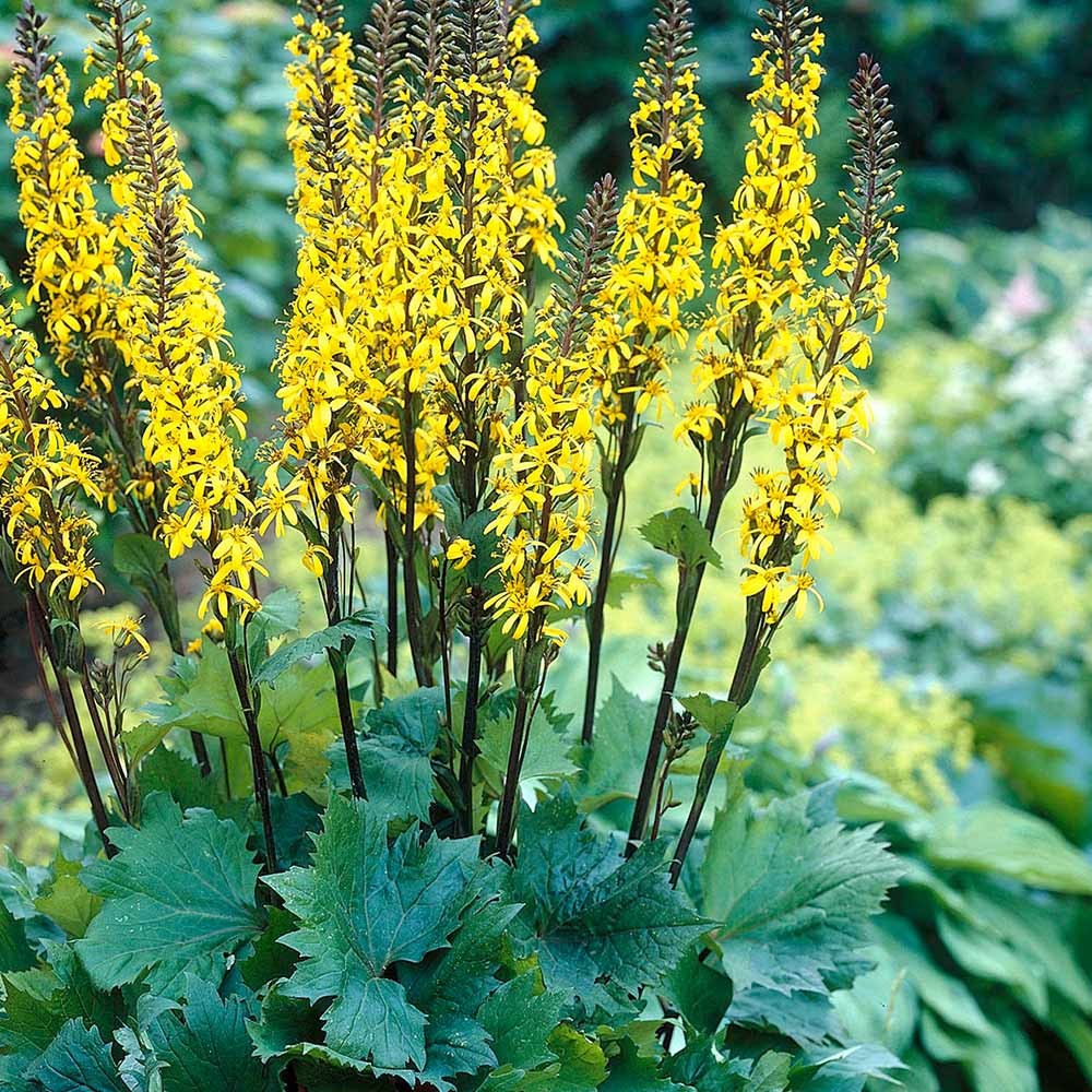 Бузульник узкоголовчатый (Ligularia stenocephala `Little Rocket`). Описание: Листья крупные, плотные, сердцевидные с грубо зазубренными краями, осенью — пурпурно-малиновые. Цветки желтые.