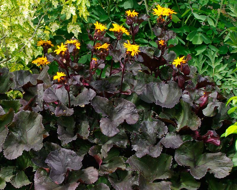 Бузульник зубчатый Мидин Леди (Ligularia Midnight Lady). Высота 70-80см. Листья округлые, блестящие, фиолетово-черные. Цветет с середины лета золотисто-желтыми ромашками. Бузульник зубчатый - эффектное растение до 100 см высотой.