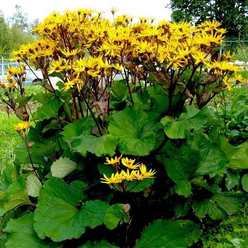 Бузульник Othello вырастает до 90 см высотой, с интенсивно-пурпурными крупными листьями до 50 см в диаметре. Соцветия мандариново-оранжевые, до 13 см в диаметре, цветет с начала сентября около 40 дней.