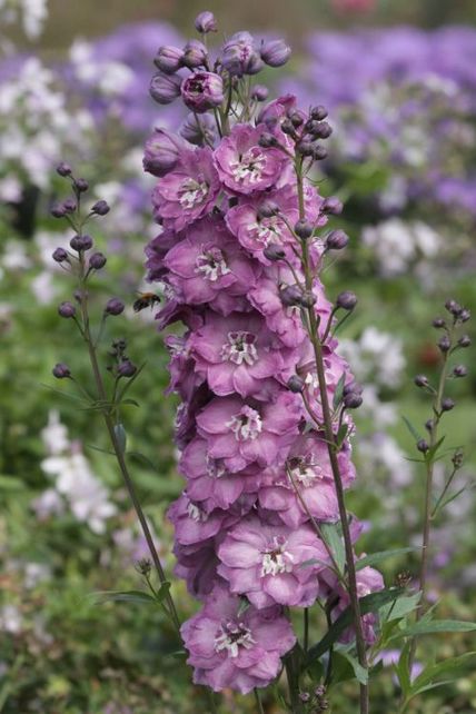 Дельфиниум высокий Дельфис Пинк Пауэр (Delphi's Pink Power) – традиционное растение для сада. Цветение его начинается в конце июня, а цветы формируются в соцветия высотой до метра. Они бывают разных оттенков – белые, розовые, синие. Листья светло-зеленого цвета пальчатой формы. Цветы прекрасно подойдут для срезки и часто используются в создании букетов. Растение отлично смотрится и развивается на солнечном участке, куда не поступает сильный ветер. В сильную жару Делфис Пинк Пауэр может получить ожоги, поэтому в месте посадки минимум 2 – 3 часа за день должна присутствовать тень.