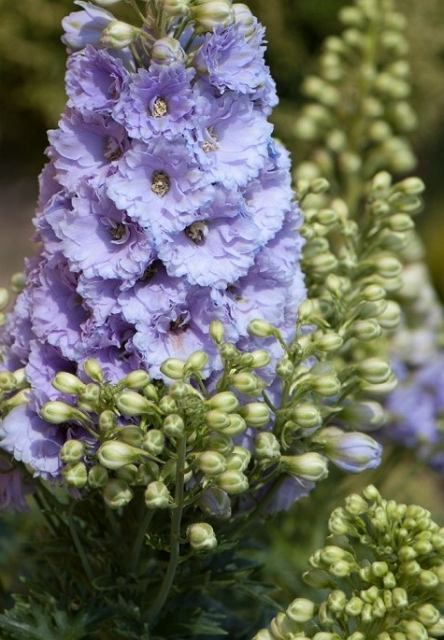 Дельфиниум Mysty Mauves - очень красивый новозеландский дельфиниум с крупными махровыми цветками, светло- и тёмно-сиреневыми с гофрированными лепестками по краям, собранными в плотные соцветия. Высота растения 120-160 см. Зимостойкость до -34 С. Стебли сильные. Соцветия плотные. Период цветения - июнь - сентябрь. Лучшие качества: великолепно цветет, стабильные и сильные цветоносы, бурный рост, сорт зимостойкий.