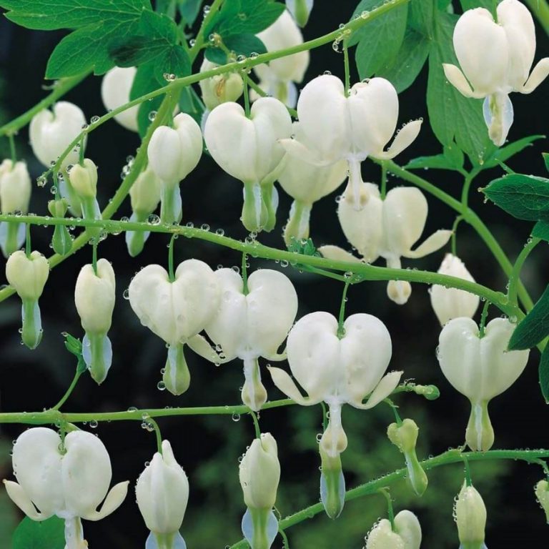 Дицентра великолепная Альба идеально подойдет к участку, если вашей основной задачей является создание неповторимого ландшафтного дизайна. Ее бутоны имеют сердцеобразную форму. Белоснежные лепестки собраны в многочисленные соцветия, которые возвышаются над зелеными листьями. Растения, несмотря на экзотичность своих бутов, абсолютно неприхотливые в обслуживании. Уход за ними простой, под силу садоводам-любителям.