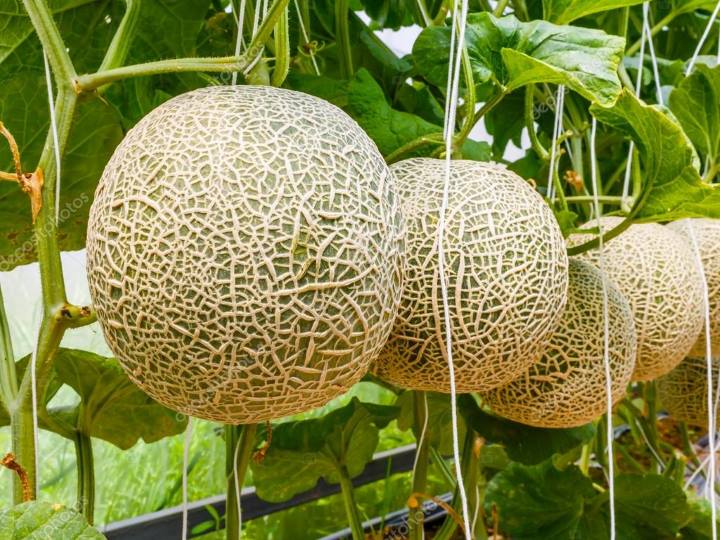 Дыня Amber Nectar - плетистое мощное растение. Плоды округло-овальные. Кожура сегментированная, желто-зеленая со светлыми полосами и хорошо выраженной сеткой. Мякоть оранжевая.