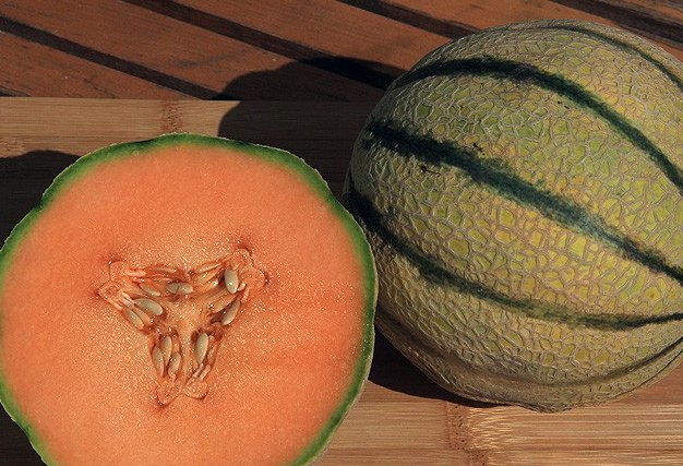 Дыня Cantaloup Charentais отличается плодами округлой формы. Кожура толстая, состоит из темно-зеленых гладких полос и сетчатых светлых зелено-желтых сегментов. Мякоть оранжево-лососевая, твердая, восхитительного, сладкого, мускусного вкуса. Внутренняя структура гладкая, нежная.