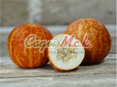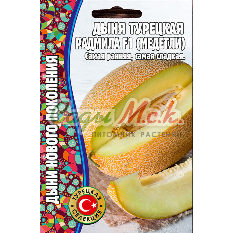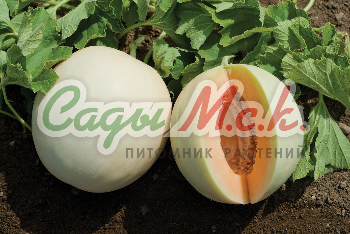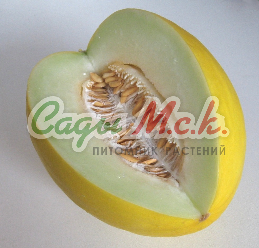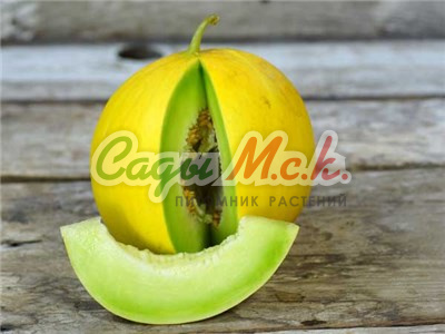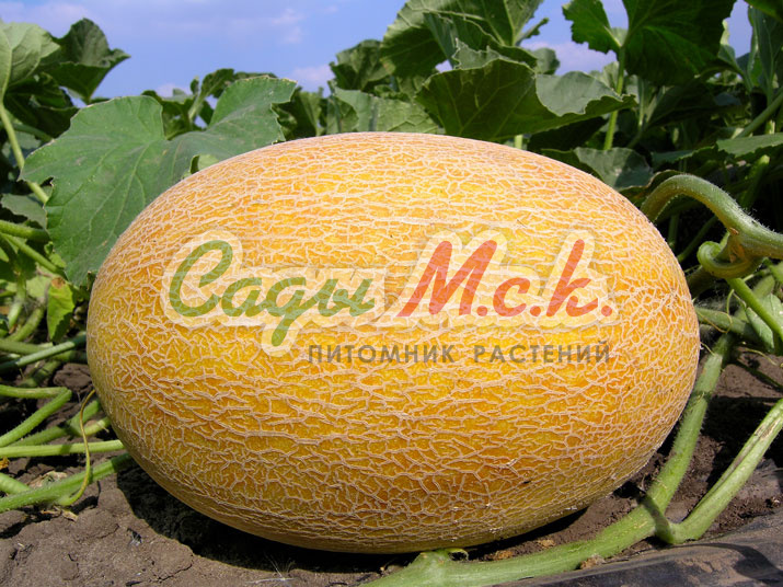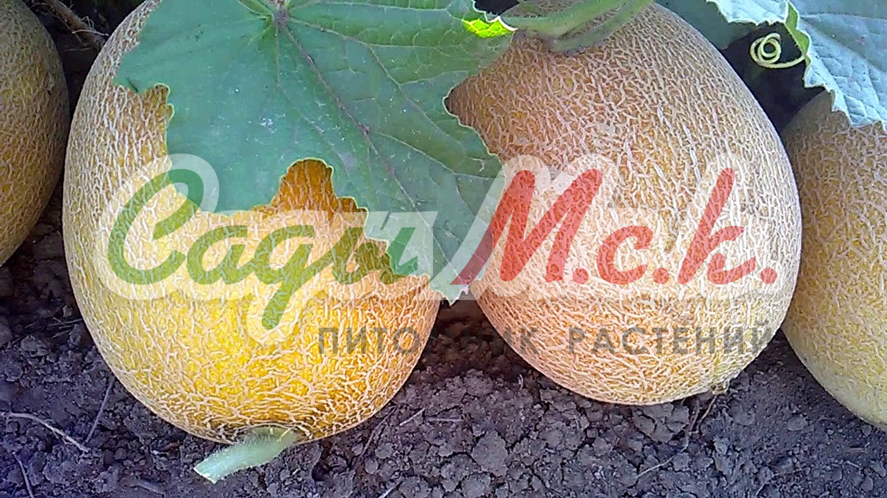 Средний по срокам созревания гибрид дыни. Период от всходов до технической спелости составляет 75-80 дней. Растение плетистое, с развитыми боковыми побегами, главная плеть средней длины. Плод округлый, гладкий, желтого цвета, без сетки, массой до 3 кг. Семенная камера небольшая, мякоть желтовато-белая, средней плотности, сочная, сладкая, нежная и ароматная. Хороша не только в свежем виде, но и для различных десертов, варенья и заморозки. Посев на рассаду в апреле, высадка рассады — в конце мая–начале июня в возрасте 30–35 дней. В средней полосе выращивается под пленочными укрытиями, в южных регионах в открытом грунте прямым посевом. Оптимальная для прорастания семян температура почвы составляет 20-25оС. Для накопления плодами сахара в период плодоношения сокращают поливы.