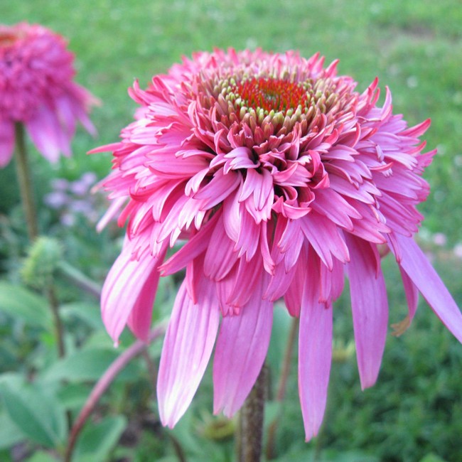 Эхинацея пурпурная Коттон Кенди: Цветки большие, махровые, помпонные, интенсивно пурпурно-розовые. Стебли крепкие.