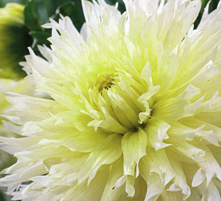 Георгина бахромчатая Айс Кристал (Dahlia cultorum). Эти растения очень выигрышно смотрятся и при оформлении партерных зон цветника, и для срезки. Букет долго сохраняет свежесть. Цветки крупные (диаметр 15 см), светло-лимонного оттенка, густо-махровые, состоящие из большого количества рассечённых по краям лепестков. Цветы высокорослые, стебли можно подвязать к колышкам. Высаживают растения на хорошо освещённых участках с плодородной почвой. Уход заключается в рыхлении, прополке сорняков, поливе и внесении удобрений. Георгины отлично смотрятся и в групповых посадках, и в одиночных композициях.