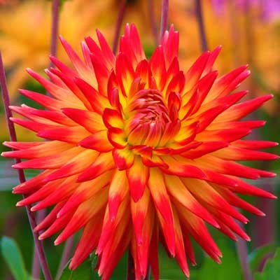 Георгина полукактусовая Карма Бон Бини - прекрасный выбор для оформления придомовой зоны, клумб и бордюров. Растение средних размеров до 90 сантиметров в высоту имеет ветвистые стебли и перистую листву. Крупные и пышные цветки достигают 14 сантиметров в диаметре, они состоят из трубчатых лепестков. Окрас данного сорта – яркий золотисто-желтый с красными переходами на кончиках лепестков. Торжественные цветы отлично смотрятся срезанными в букетах. Для хорошего роста георгине требуется удобренная почва, солнце и регулярный полив. На зимнее время луковицы выкапывают для хранения.