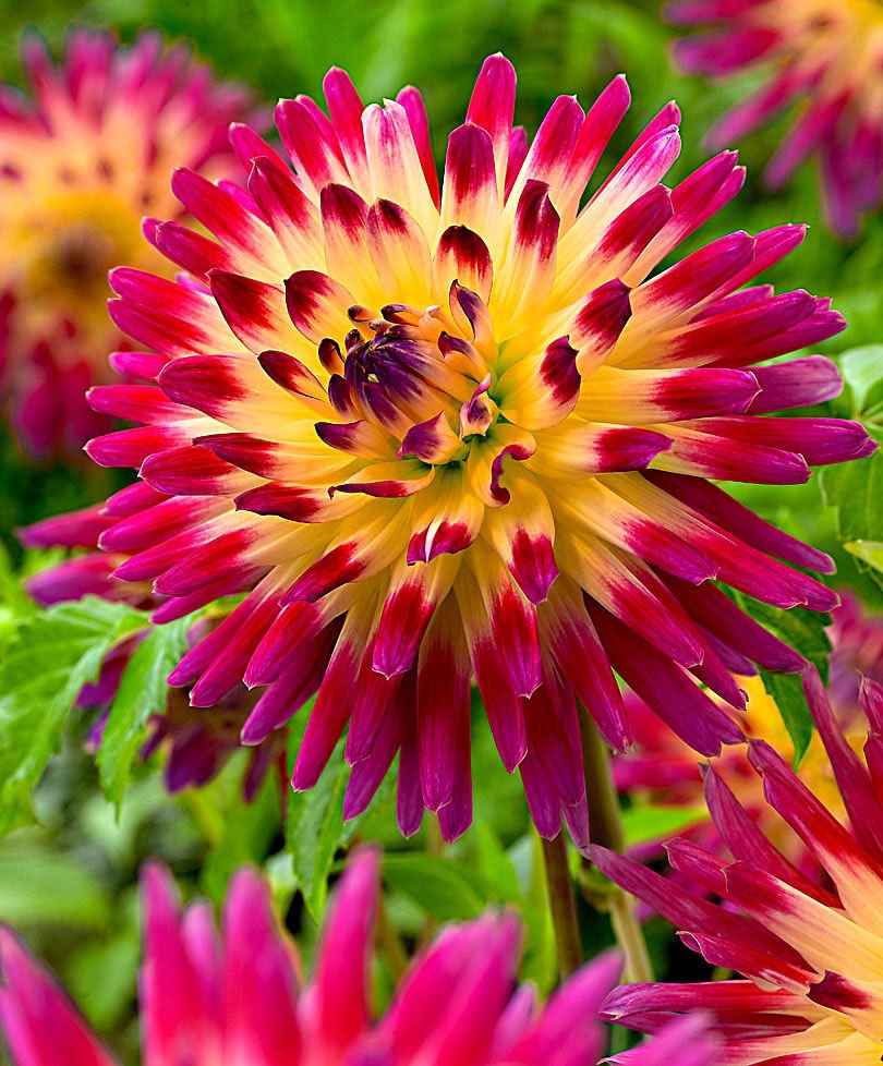 Георгина полукактусовая Таити Санрайз (Dahlia cultorum) удивляет контрастной раскраской цветов. Желтоватый бутон, обрамлен градуированными от светло-розового до ярко-малинового оттенка игольчатыми лепестками. Издалека может показаться, что цветы сияют. Крепко сидящие на бутоне лепестки делают этот сорт пригодным к срезу и формированию в букеты.