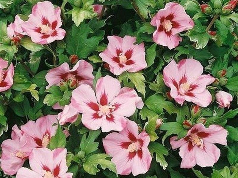 Гибискус Hamabo - листопадный быстрорастущий кустарник. Листья расположены очерёдно, напоминают листья хризантемы, яйцевидные, 3-лопастные, зелёные. Листья распускаются поздно, в холодные весны молодые листья часто жёлто-белые. Осенняя окраска жёлтая. Цветёт в августе-сентябре. Цветки розовые, с краю немного темнее, полосатые, с тёмно-красным, очень крупным пятном в середине, простые, диаметром 9-10,5 см. Плоды коричневые коробочки, состоящие из 5 частей. Стержневая корневая система, корни мясистые. Светолюбив, выносит небольшое затенение.