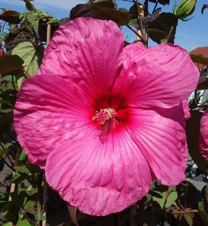 Гибискус Royal Gem - травянистый многолетник, полуодревесневающий. Темно фиолетовая листва, овальной формы и немного загнутыми краями, и не сильно выраженными лопастями. Большие насыщенно розовые цветы диаметром до 30 см, лепестки перекрывают друг друга и светятся на фоне темной листвы. У кустов нет эффекта «голых ног», куст покрыт листьями снизу доверху. Цветение в течение всего лета до осени. Куст высотой 90 см – 1.20 см, ширина – 60-90 см. Морозостойкий, выдерживает температуру до – 34С.