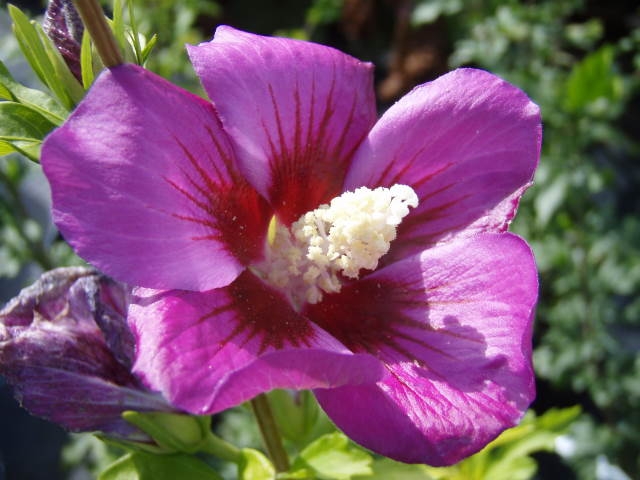 Гибискус Russian Violet - кустарник высотой до 1,5-2м с крупными цветками до 12 см, похожими на цветы мальвы. Цветение с конца июня до конца сентября. Множество цветков появляются один за другим очень долгое время, и по всей высоте куста. Растение не боится формирующей стрижки, быстро отрастает.