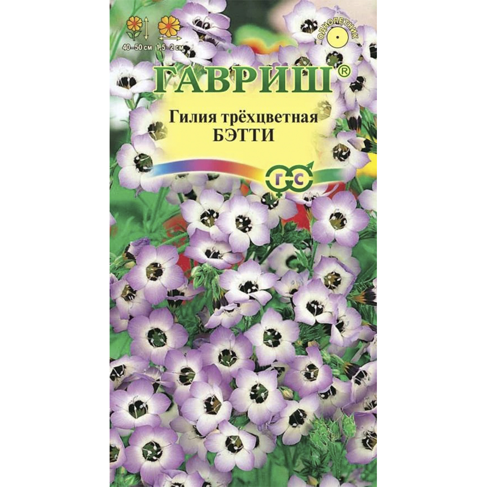 Однолетнее, ажурное растение семейства Синюховые, высотой до 40-50 см. Диаметр цветущего куста около 40 см. Похожие на колокольчики цветки диаметром 1,5-2 см собраны в небольшие рыхлые кисти. Окраска цветков сиренево-голубая, внутри венчика имеется черно-фиолетовое пятно. Светолюбивое растение, не выносит холодных и сырых мест, предпочитает легкие, песчаные, не слишком бедные почвы. Посевы производят в марте-апреле в парниках, всходы появляются через 2 недели. Высадку рассады в грунт производят после окончания весенних заморозков, выдерживая расстояние 15-25 см в зависимости от высоты растений. Цветение начинается в июле и продолжается до конца августа. Гилия трехцветная используется в цветниках, рабатках, для оформления ваз и балконов.