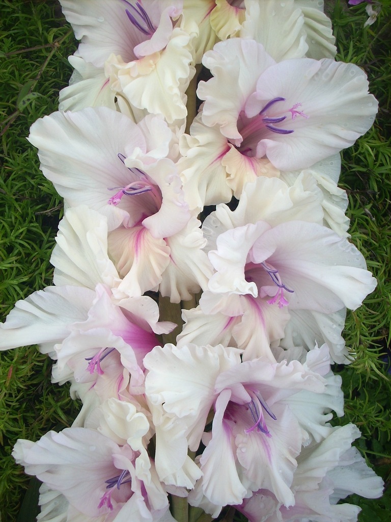 МОРСКАЯ ЦАРИЦА. Описание: Мраморно-белый с сиреневым румянцем в горле и сиреневым язычком на нижнем лепестке. Высокий колос из 25 бутонов держит открытыми 9 крупных цветков очень плотной фактуры. Хорошо растет и размножается.