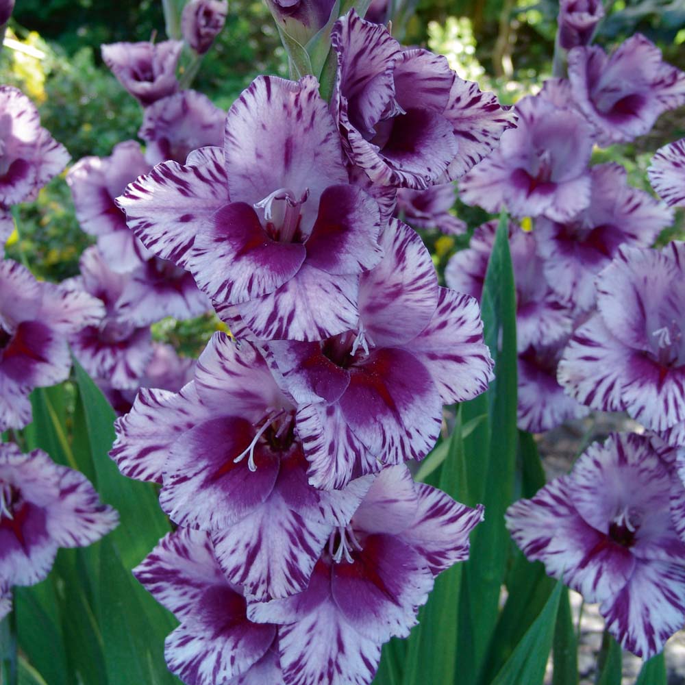 Крупноцветковые гладиолусы - Имеют стебель длиной от 0,9 до 1,3 м (иногда до 2 м) с неправильно расположенными цветками треугольной формы диаметром от 3,5 до 18 см. В соцветиях может быть до 28 цветков, длина стрелок достигает 90 см. Палитра разнообразна, способны цвести долгое время – с раннего лета до начала осени. Крупноцветковые гибриды, в свою очередь, делят на группы в зависимости от размера бутонов и их окраски