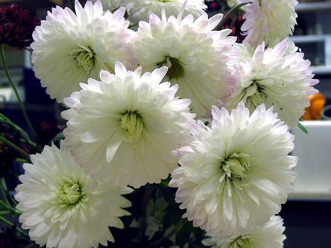 Хризантема Snowball - соцветия махровые, небольшие, 56- см в диаметре, белые со слегка розовыми кончиками. Куст высотой до 60 см.