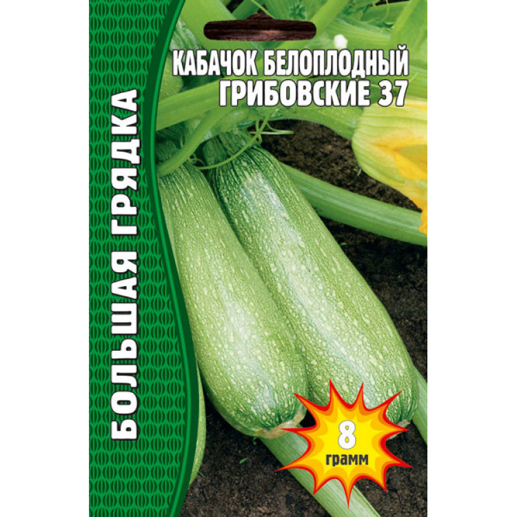 Кабачок Белоплодный Грибовские 37, популярный среднеранний сорт, от всходов до первого сбора плодов 46-50 дней. Урожайность высокая, 7-8 кг/м2.