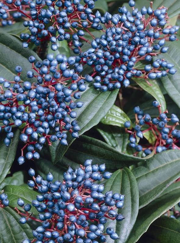 Калина Давида - низкорослый вечнозеленый медленнорастущий кустарник, вырастающий до 1 метра в высоту, с горизонтально растущими, симметрично расположенными побегами. Особый интерес представляют декоративные, кожистые, вечнозеленые, эллиптической формы, листья растения, вырастающие в длину до 15 см, на которых заметны глубокие параллельные жилки. В июне кустарник зацветает бело-розовыми цветками, собранными в зонтиковидные соцветия, которые затем превращаются в ягоды необычной голубой окраски, созревающие в октябре.