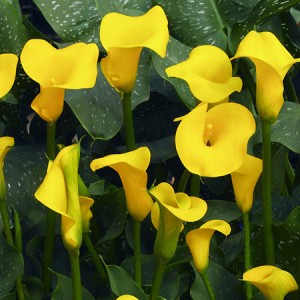 Калла Голд Раш относится к группе многолетних клубневых растений. Цветок насыщенно желтый, воронкообразной формы. Высота прямых цветоносов достигает 60-90 см. Листья стреловидные, остроконечные или в форме сердца, темно-зеленые с белым крапом и бордовой каймой. Цветение продолжается с июля по сентябрь. Клубни каллы высаживают в апреле на глубину 15 см на расстоянии 30 см друг от друга. Предпочитают солнечное место. влажную, дренированную, богатую полезными ископаемыми и гумусом почву. Перед самыми заморозками, надземную часть растения удаляют, клубни выкапывают, оставляя 2-3 листочка на черенке, и кладут на хранение. Размножение производится делением клубня. Используется в ландшафтном дизайне, на выгонку и срезку.