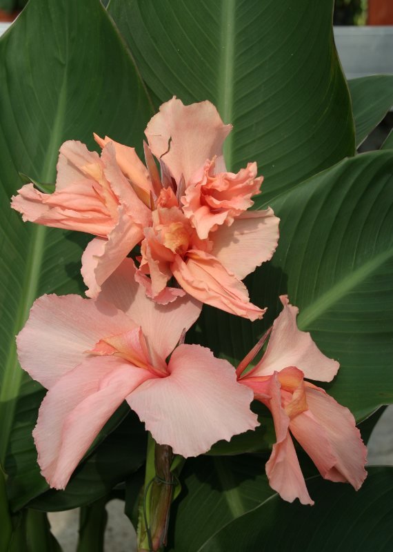 Канна карликовая Гном (Gnom)- цветки очень крупные, с широкими шелковистыми лепестками с волнистым краем. Цвет розово-персиковый. Растение компактное, не более полуметра высотой. Каждое корневище образует несколько цветоносов, создавая довольно пышный куст. Цветёт сорт Гном с июля по октябрь, заморозков не выносит.