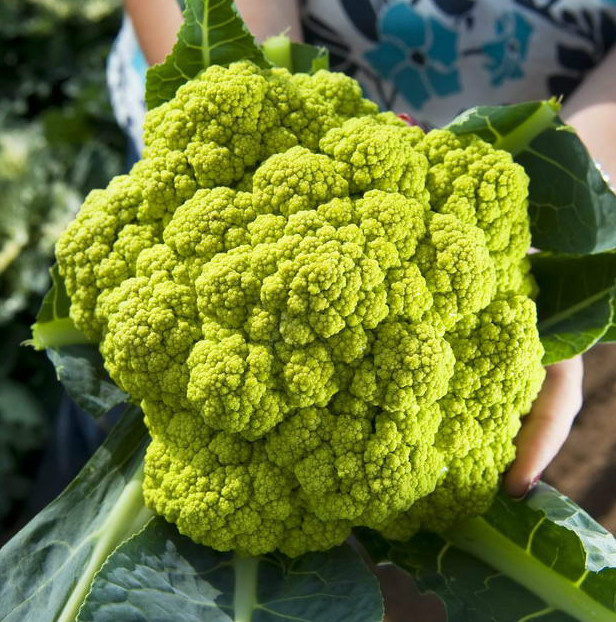 Капуста цветная Green Trevi - "зеленый" сорт. Головка необычной, слегка округлой формы, с бугорками, окружена большими темно-зелеными покрывными листьями. Окрас соцветия насыщенно-зеленый, однотонный.