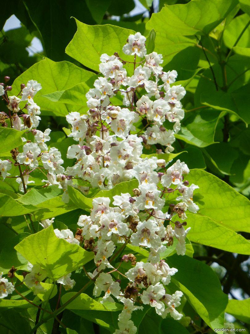 Саженцы  Катальпа Aurea вырастают в невысокое дерево с ассиметричной кроной. Данный сорт выполняет свою основную функцию – декоративную, он служит отличным украшением для любого сада. Листья дерева светло-зеленые очень крупные имеют форму сердца, распускаются поздно. Большие соцветия белого цвета формируются в розетки, их длина может достигать тридцати сантиметров. На деревцах также присутствуют отдельные желтоватые цветки с малиновыми вкраплениями. Плоды этого крупномера очень необычны и интересны, их форма в виде стручков очень похожа на бобовые культуры.