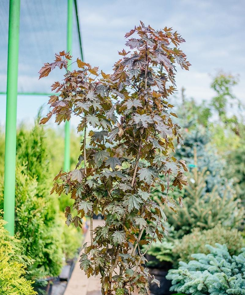 Саженцы клена остролистного Faassens Black  при должном уходе вырастают в небольшие деревья с округлой или пирамидальной кроной.Пятилопастные листья в начале сезона обладают светло-красным оттенком, по мере роста насыщенность его увеличивается до почти черной в конце сезона. Перед листопадом окрас приобретает фиолетовый оттенок.Цветки небольшие желтовато-зеленого окраса привлекают внимание еще и душистым ароматом.Плод – крылатка.Достоинства клена остролистного Faassens Black: хорошо смотрится как в одиночной посадке, так и в декоративной композиции.
