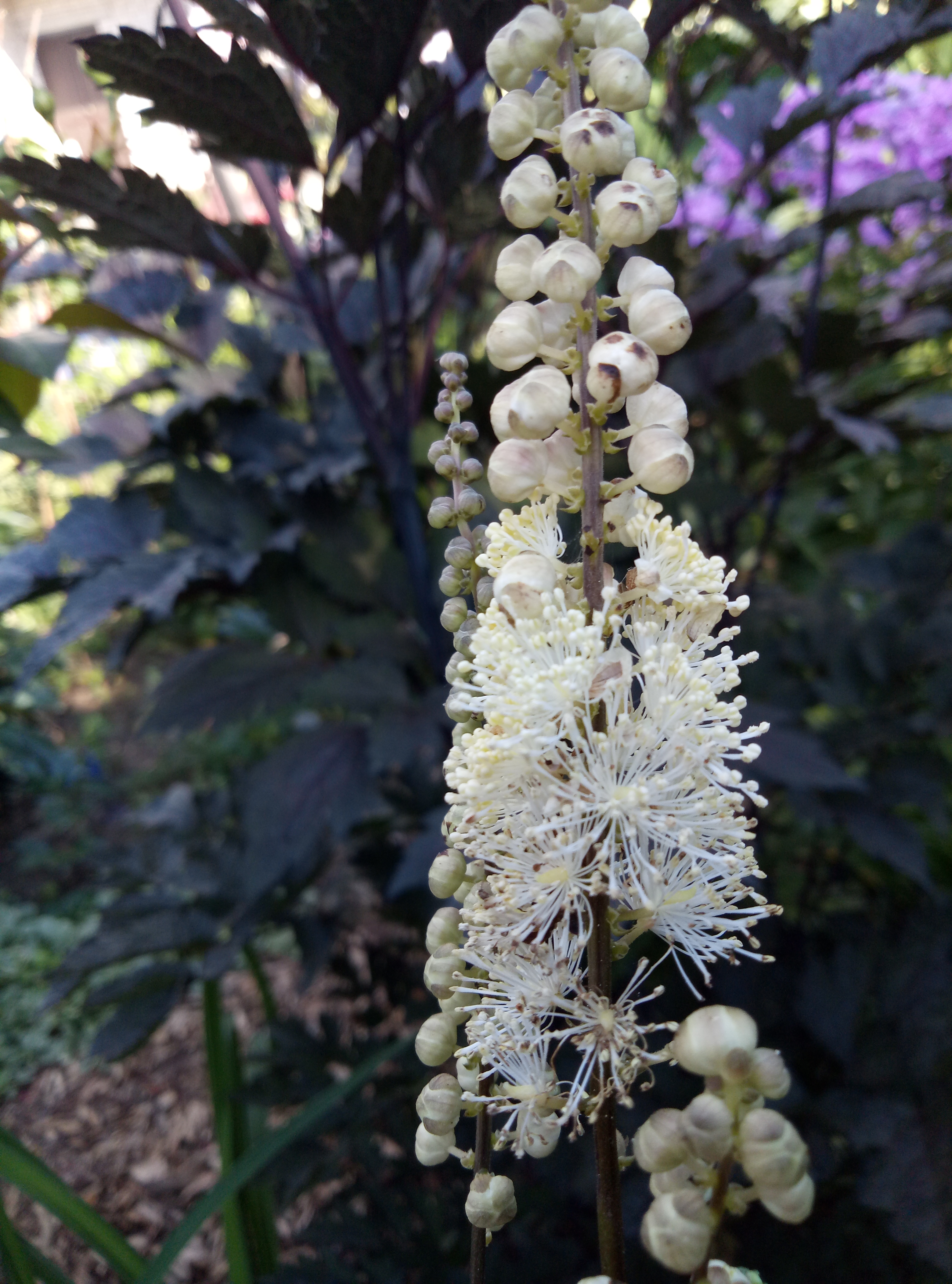 Клопогон (Цимицифуга) японский Сильвер Данс: Высокое многолетнее растение. Высота до 150-180 см. Листья сильнорассеченные, ярко-зеленые, собраны в прикорневую розетку. Высокие цветоносы заканчиваются длинными, узкими соцветиями, состоящими из белых мелких цветочков.