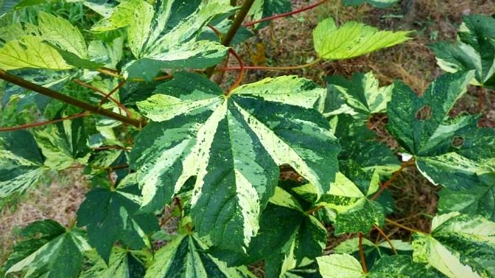 Дерево, высотой около 20 метров (высота растения зависит от высоты штамба), крона имеет форму широкой пирамиды. Внимание привлекают листья во время их распускания. В этот период они ярко-розовые с желтовато-розовыми пятнами, но очень быстро становятся зелеными с белыми и желтыми пятнами и полосами (иногда появляются пятна розового цвета). Позже листья становятся зелеными с многочисленными разноцветными крапинками.