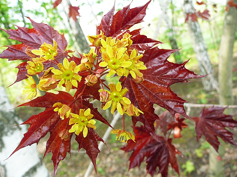 Саженцы клена остролистного Crimson King – отличный способ оформления для разных участков и территорий.Вырастает до 20 м. Для кроны характерна пышность. Листья обладают при распускании кроваво-красным оттенком, который в дальнейшем становится темно-пурпурным, а осенью – фиолетовым.Плоды-крылатки имеют красный цвет.Цветки появляются вместе с листьями, поэтому их желто-оранжевый окрас хорошо сочетается с цветом листвы.Среди плюсов стоит выделить неприхотливость клена остролистного Crimson King его быстрое разрастание, а также стойкость к засухе.