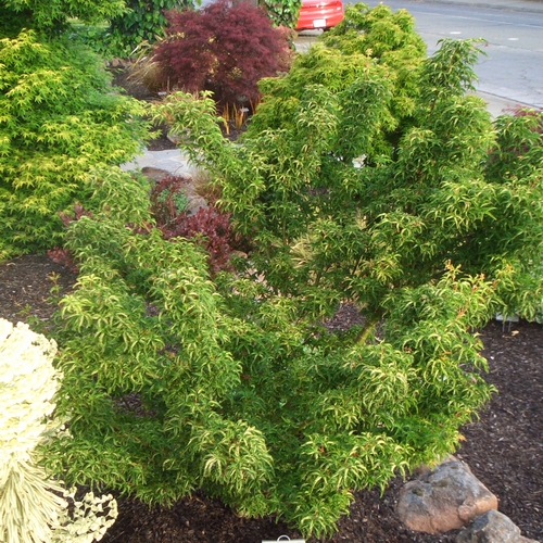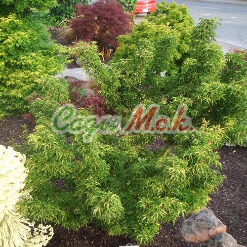 Один из самых интересных кленов, который редко бывает в продаже. Он является ценным дополнением для сада и заслуживает пристального внимания. «Shishigashira» в переводе означает «голова льва». 7-лопастные маленькие листья, 3-5 см длиной и шириной, морщинистые, иногда слегка закрученные, неравномерно разрезанные, глубокого зеленого цвета. Осенняя окраска интенсивно золотисто-желтая, с розовым и карминовым налетом.