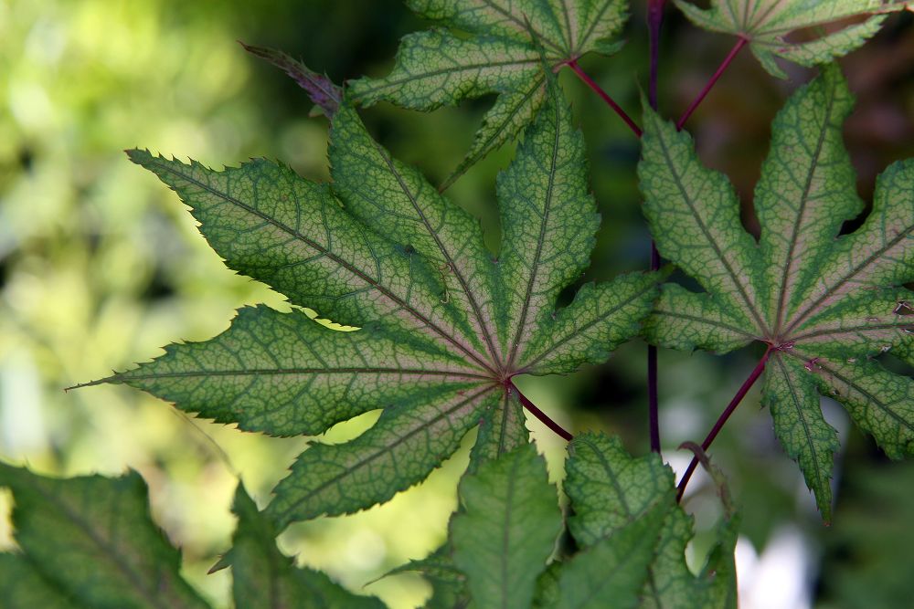 Потрясающие сетчатые листья. Весенний окрас листьев кремового цвета с выступающими темно-зелеными прожилками. Затем листья более темно зеленые в течение лета, прежде чем стать красными осенью. Листья чувствительны к жаркому послеполуденному солнцу, предпочтительна защита