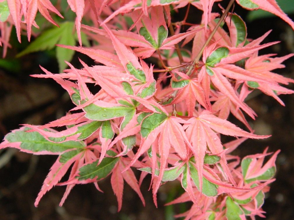 Acer palmatum ‘Кагири-Нишики’ - это пестрый японский клен с глубокими лопастями, средне-зелеными листьями со слегка голубоватым оттенком и розовыми и белыми краями в течение всего лета. Листья становятся малиново-золотыми перед тем, как опасть осенью.