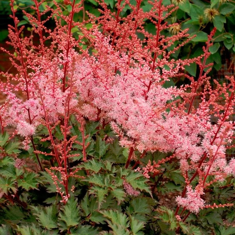 Астильба Арендса Делфт Лейс (Delft Lace) пополняет коллекцию растений, цветущих в нежно-розовой гамме. Подобно пышному облаку на закате, возвышаются соцветия над пурпурно-зелёной кружевной листвой. Цветущая в июле астильба наполняет сад нежным медовым ароматом. А как приятно устроиться с чашечкой чая в прохладной тени в окружении этих нежных растений! Высота стебля Астильбы Арендса Делфт Лейс достигает 70 сантиметров, почти половина из которых приходится на рыхлое соцветие. Мелкие ярко-розовые бутоны начинают раскрываться снизу вверх, преображая тонкие пурпурные веточки в розовато-белые изящные метёлки.