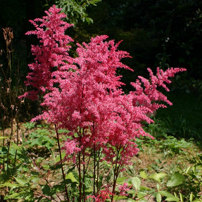 Астильба простолистная Афродита - эффектный сорт. Высота куста до 50 см. Период цветения: в июле-августе. Метелки воздушные, кораллово-красного цвета. Посадку производят ранней весной или в начале осени. Для посадки выбирают слегка затенённые места (лучше растут у водоёмов или во влажных полутенистых местах). Астильба простолистная Афродита предпочитает плодородную влагоёмкую почву, хорошо удобренную перепревшим навозом. Размножают астильбу делением кустов весной или осенью. В конце сезона стебли астильбы обрезают на уровне грунта и мульчируют торфом или почвой.