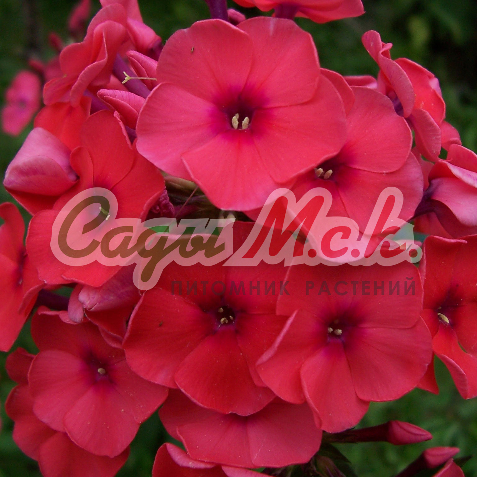 Флокс метельчатый Гренадин Дрим (Grenadine Dream Phlox paniculata) дружно зацветает в разгар лета – в июле месяце. Его пышные и округло-конические соцветия красно-малинового цвета с затемненной серединой и белой подножкой в диаметре составляют около 3,5 см и радуют глаз на протяжении всего лета. Они быстро разрастаются, для рассаживания можно использовать деление куста на части. Флокс метельчатый Гренадин Дрим - неприхотливое растение с прямостоячими стеблями средней высоты в 70 см, которое выигрышно будет смотреться на передних планах. Крупные соцветия любят полив и не выгорают на солнце.