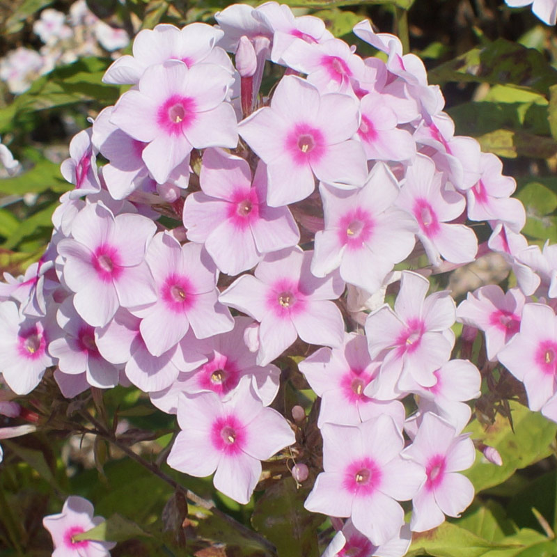 Флокс метельчатый Мисс Холланд - эффектный, контрастный сорт, светло-светло-розовый, почти белый, с большим малиновым кольцом в центре цветка. Мощный, прочный куст, высотой 75-90 см.