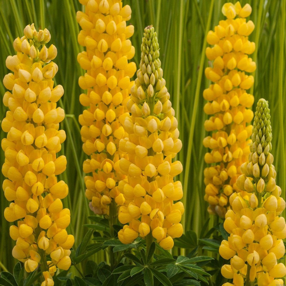 Люпин многолистный Дезет Сан - сверкающий, ярко-желтый цвет. В высоту остигает до 80 см. Очень крупные набивные соцветия. Компактный, коренастый, не требующий подвязывания и опоры. Среднепоздний. Очень продолжительное цветение с июня до сентября. Время цветения Люпина многолистного Дезет Сан: июль-сентябрь.