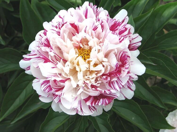 Травянистый пион Candy Stripe махровый. Крупные белые соцветия с малиново-красными полосками притягивают восхищенные взгляды. А их легкий, приятный аромат не оставит никого равнодушным. Средне-поздний срок цветения. Высота 80 см. Размер цветка 18 см.