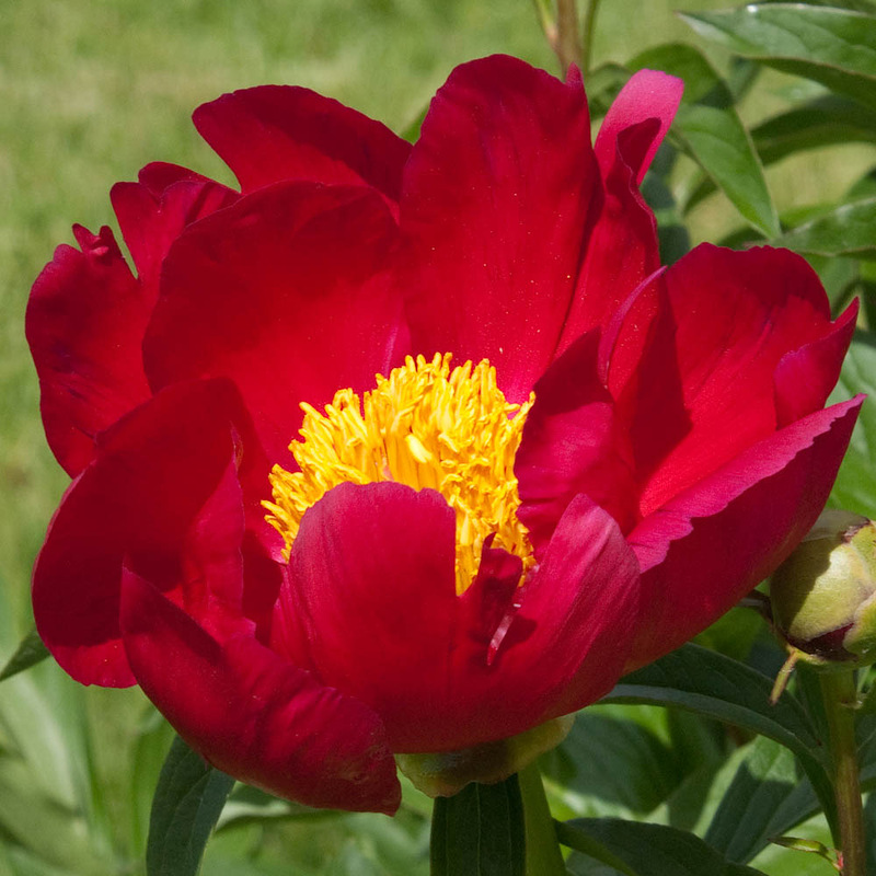 Саженцы пиона Scarlet O`Hara являются обладателями пышных и ярко-алых соцветий. Их диаметр может достигать восемнадцати сантиметров, при этом бутоны простые и имеют несколько рядов широких лепестков. Данный сорт пиона относится к межвидовым гибридам, высота его стеблей составляет менее метра. В центре бутона в виде огненного шара располагается множество ярких желтых тычинок. Растение очень быстро разрастается, источая нежный и приятный аромат. Срок цветения саженцев очень ранний, в этот период куст покрывается крупными алыми бутонами, одновременно простыми и роскошными.