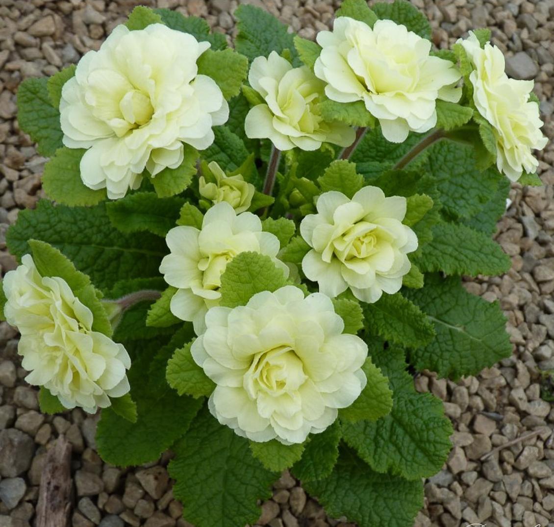 Примула обыкновенная Джэк Лэд - высота растения 10-15 см. Цветы махровые, белые с кремовым оттенком. Большого ухода примулы не требуют. В рыхлой земле быстрее образуются корни у молодых розеток. В течение вегетационного сезона растения подкармливают три раза. Первую подкормку проводят рано весной, вторую — через 2—3 недели, третью — в конце июля—середине августа фосфорно-калийными удобрениями. Примулы очень отзывчивы на внесение навозной жижи в течение вегетационного сезона. Ежегодно под Примулу Джэк Лэд подсыпают 2—3 см рыхлой питательной земли, а еще лучше этим слоем покрыть всю площадь, занятую растениями.