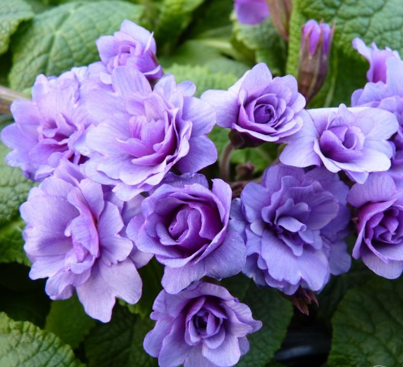 Примула обыкновенная Пёпл Сторм - высота растения 10-15 см. Цветок махровый, светло-фиолетовый с розовым отливом, лепестки атласные. Большого ухода примулы не требуют. В рыхлой земле быстрее образуются корни у молодых розеток. В течение вегетационного сезона растения подкармливают три раза. Первую подкормку проводят рано весной, вторую — через 2—3 недели, третью — в конце июля—середине августа фосфорно-калийными удобрениями. Примулы очень отзывчивы на внесение навозной жижи в течение вегетационного сезона. Ежегодно под кустики Примулу обыкновенной Пёпл Сторм  подсыпают 2—3 см рыхлой питательной земли, а еще лучше этим слоем покрыть всю площадь, занятую растениями.
